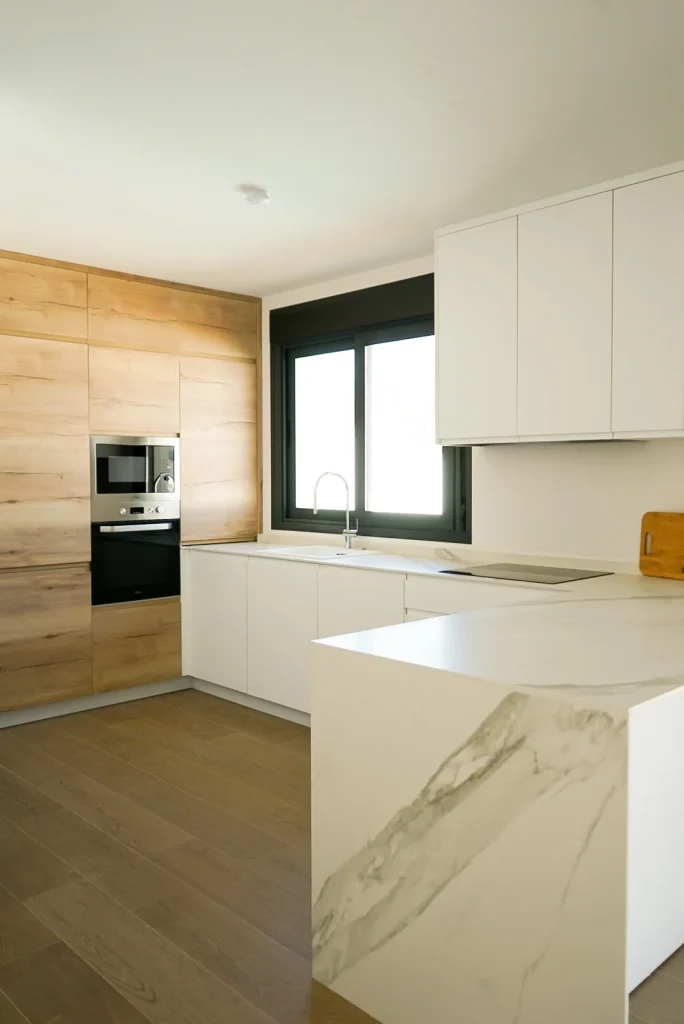 El estilo nórdico tiene un fuerte énfasis en la conexión con la naturaleza, y esto se refleja en los materiales utilizados en las cocinas. Madera clara, piedra natural y acero inoxidable son algunos de los materiales más utilizados. Los muebles y encimeras en madera no solo añaden textura y color, sino que también aportan una sensación de calidez y confort. Los acabados sencillos de la madera y las superficies de piedra natural como el mármol o el granito dan a la cocina un aire sofisticado, pero sin perder la esencia acogedora que caracteriza este estilo.